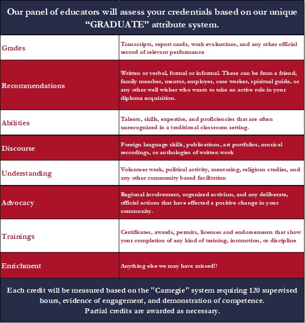 Our review panel will consider your entire story before deciding what more you need to do to graduate. We will pass your application through our “GRADUATE” rubric, looking carefully for credits you have earned in any of the following categories: